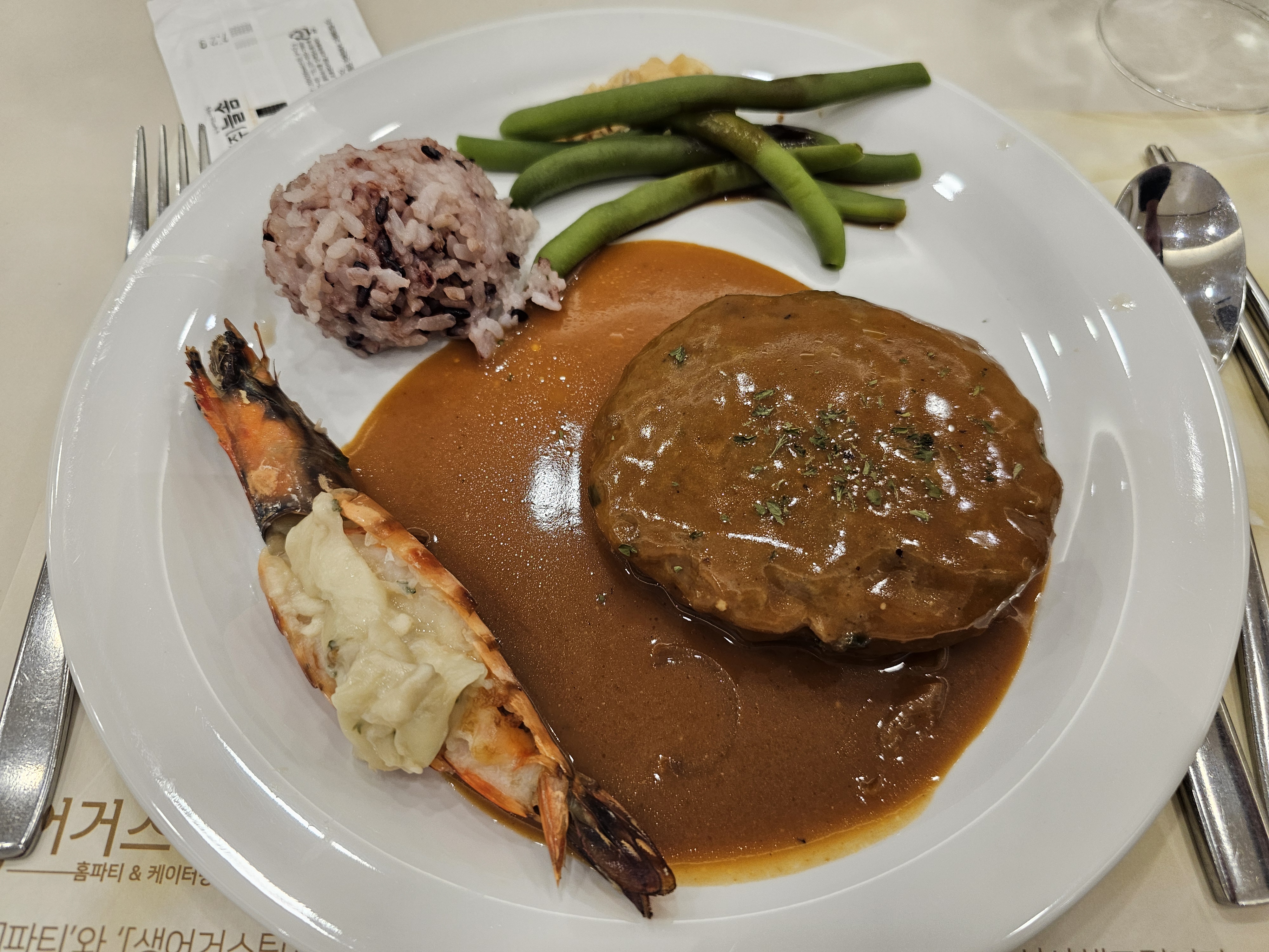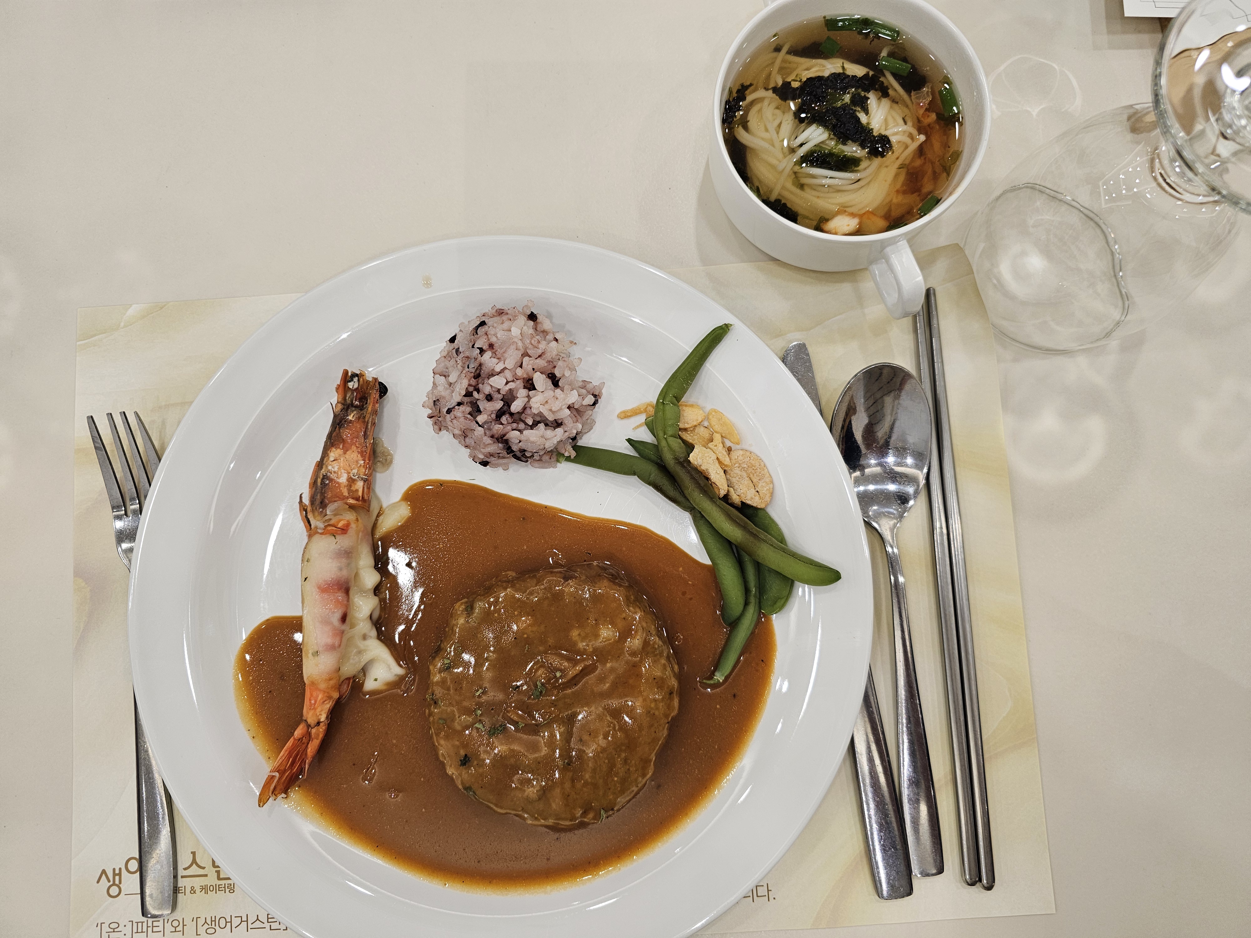 메인으로 나오는 함박스테이크와 치즈새우 또 잔치국수