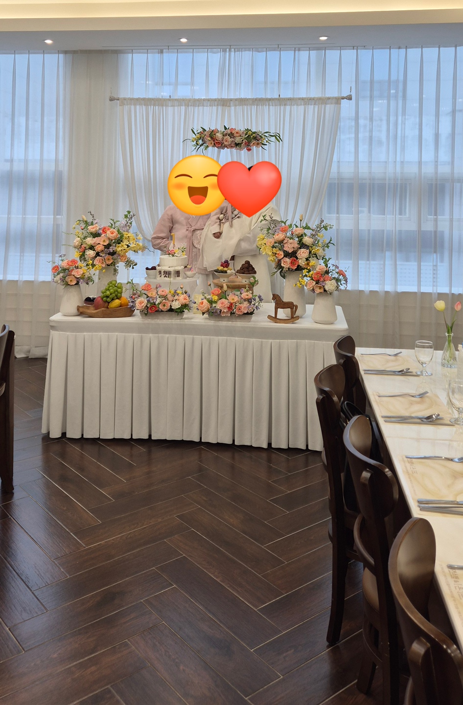촛불 점화-생일 축하 노래-양가 어르신 덕담-돌잡이-감사인사-성장동영상 시청-식사 순으로 진행 됩니다.